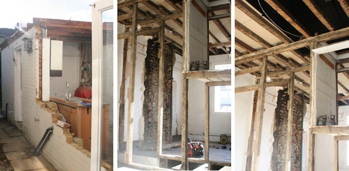 (右)1970年代に増築された狭いキッチンエリアは建造クオリティが低いため建て直し。