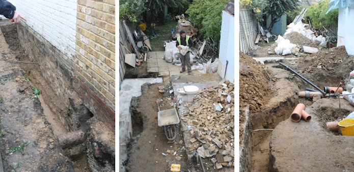 (右) コンクリート壊して土が剥き出しになり、ヴィクトリア時代の下水道(粘土製)があらわになったところ(2階から庭方面を見たところ)。 この粘土製の下水道はテラスハウス(長屋)の後ろを流れ共有であるため数十軒からブツが流れてくるもの。 常時使用中のこの下水管を割らないように切り、新しい管を差し込むという技を数秒でやってのける。 さらに現代では敷地内の下水道栓は家の外(つまり庭)に置かなければならないため、庭まで掘るはめに。