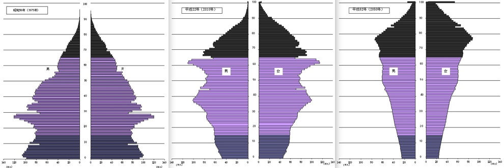 国の将来を占う上で最も重要で確かな指標のひとつがDemographics(人口動勢)。 視覚化すると私たち世代はこういう時代に生きています(人口ピラミッドは総務省統計局より。 クリックすると大きくなります)。 左のピラミッドの時代(1975年)に団塊の世代の両親のもと生まれ、出産適齢期(という言葉もアレですが)の30代半ばにはすでに高齢両親・祖父母の福祉負担が重くなっており(真ん中のピラミッド、2010年)、自分の子どもたちが今の自分の世代になる頃には(右のピラミッド、2050年)「そして誰も(子どもが)いなくなった」状態になっている・・・