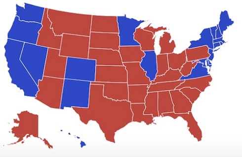 次の地図は2016年の米国大統領選挙の結果。 赤がトランプ支持が過半数だった州、青がクリントン支持が過半数だった州。