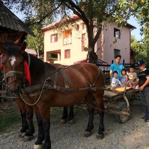 日曜の朝9時、約束通り農家のトーゴさんが荷馬車で到着。 馬のあまりのデカさにかなりビビりつつ記念撮影。 トーゴさんは熱心に話しかけてくれるが、ルーマニア語なので何を言っているのかわからない。 とりあえず雰囲気で会話。