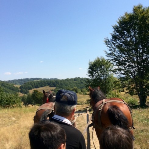 朝10時半頃、荷馬車で山上り開始。 この時期のマラムレシュは日中の気温が連日34℃。 ロンドン生まれロンドン育ちのうちの子どもたちは暑さに慣れていないので日中はバテバテ。 遮るものがない山では太陽が容赦なく照りつける。 山の道は土なので馬車が通った後の轍が深く残っている。 1回、片輪が轍の中、片輪が外のままで荷台(及び乗っている私たち)がひっくり返りそうになった。 いやー、危ない、危ない。
