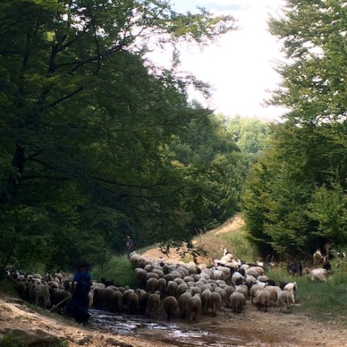 その示す先に行くと・・・ いきなり10頭ほどの屈強な男、、、ではなく牧羊犬にささっと四方八方囲まれる。 チームで熊や狼を撃退するよう訓練されている彼らは敵らしきものを見つけるや否や対象を取り囲んで今にも飛びかからん勢いで吠え立てる。 勝手のわかるガイドといた私たちはよかったが、ペットの犬の感覚で近寄ってしまう観光客は危ないらしい(という情報は事前に仕入れておいたので、よかった)。 牧羊犬に慣れているトーゴさんが犬を何やらルーマニア語で諌めているのを見ながら背後からついていくと、谷のちょろちょろと水が流れる岩場に数十頭の羊・ヤギたちと羊飼いの男の子が休んでいた。