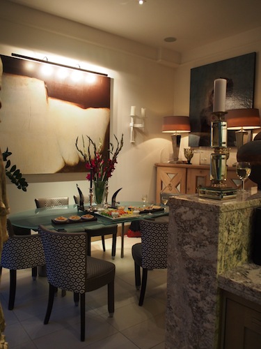 ダイニングの壁にももちろんアート。 アートを飾る際はライティングは致命的に大事で、絵の上のピクチャーライトは大きさも位置も完璧です。 このことからわかるように、家をデザインする際は、クライアントの手持ちのアートコレクションを把握し、どのアートをどのスペースに飾るか決め、足りないアートを一緒に探します。 イギリスにはアートのアドバイスだけを専門に行うコンサルタントもいます。 見えにくいですが、奥にある木製のサイドボード、これも非常に高価なアンティークで、サイドボードの幅に合わせて後ろの壁の長さを決めています。