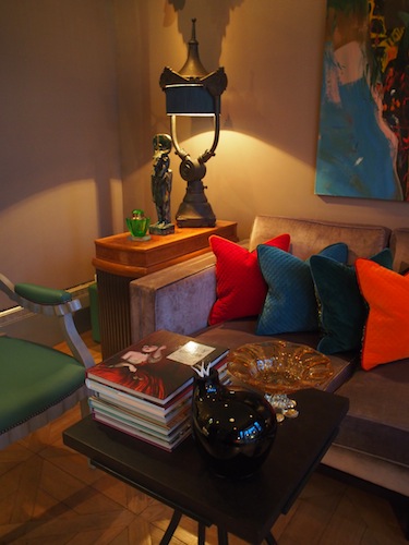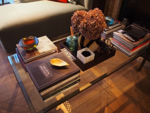 大判のアート本・デザイン本のことを”コーヒーテーブルブック”と呼びますが、まさにコーヒーテーブルブックで埋め尽くされたコーヒーテーブル。 床の寄木細工パターンが個性的。 寄木細工の床は非常にヨーロッパ的でヨーロッパではよく見るのですが(イギリスでも最近リバイバル中)、こういうパターンはあまり見たことがない。