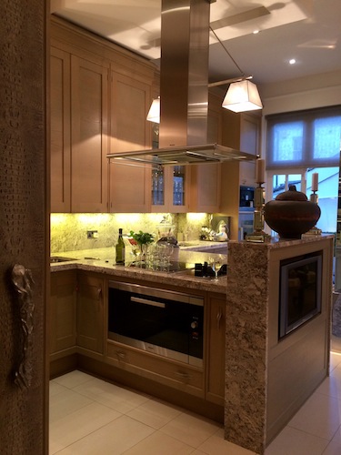 壁一面に造り付けのキッチン棚、真ん中にセミアイランドがありオーブンやIHの調理場が設置されています。 シンクは洗い物用のシンクが食器洗浄機の近くにひとつ、カクテルなど飲み物をつくる用に小さいものがひとつ、とふたつあります。 セミアイランドの端が高くなっているのは隣にあるダイニングからキッチンの上の汚れ物があまり見えないようにするためと薄型テレビを見やすい位置に設置するためでしょう(右手の壷の下にある黒い画面はテレビ)。