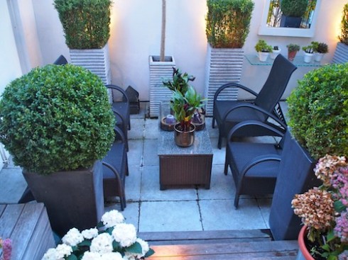 キッチンを抜けて外に出ると中庭。 訪問したのが夕方だったので、もう樹木の後ろに植え込まれたランプが点いています。 戸外に設置したランプは中で操作するのか、日光センサーで自動点灯にするのか、どの位置からどの角度で必要か、などアウトドアの家具の配置と植物の配置を決める中で決定するのもデザイナーの仕事です。 別途ランドスケープデザイナーやガーデンデザイナーを雇う場合もありますが、この規模ならStephenが自身でされたのでしょう。