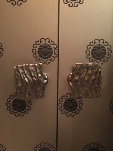 こちらは廊下側から見た別のドアノブ。 この壁紙は日本でも輸入販売されているニナ・キャンベルのものですが、少し薄くて使いにくかったので、StephenがNinaご自身に「薄いからもう少し厚みを持たせた方がいい」と言ったところ、それ以降、壁紙は全レンジ少し厚いスペックに替わったそう。