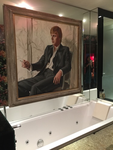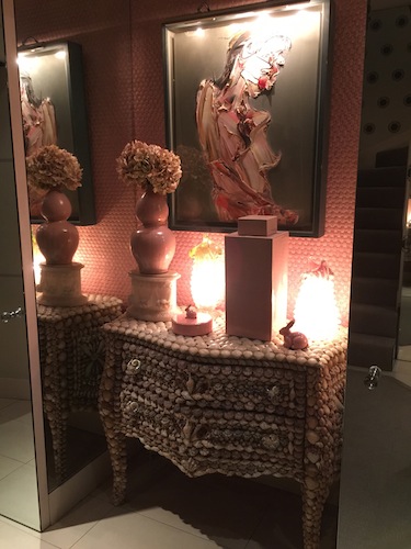 パリで買ったという貝殻を隙間なく敷き詰めたアートな家具、そして絵の具が大きく盛り上がりダイナミックな肉筆の筆致が大胆なアートはピンクのグラデーションです(写真ではよく見えませんが、Stephenのウェブサイトの写真でよく見えます)。 その他は後ろの壁紙も家具の上の花瓶や小物もピンクでまとめられています。 全部ピンクなのにちっともガーリーじゃない、とてつもなく個性的でエキセントリックな空間で全て事前に計算し尽くされているのに絶句してしまいました。