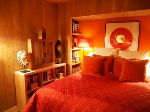 こちらゲスト用のベッドルーム、メインの色はオレンジ。 ベッドの上に出ている梁はこの部屋の上に階段が通っているためですが、梁を利用して壁と同じ木材で覆い、さらにベッドの両脇には造り付けの本棚をこしらえることにより、まるでデザインの一部であるかのように見せています。 また写真には映っていませんが、地下1階のこの部屋と主寝室は小さな中庭に通じ、地上から光が入ります。 その中庭の壁を主寝室から見える壁はチョコレートブラウン、ゲスト寝室から見える壁はオレンジに塗って部屋との統一感を出す、という徹底ぶり。 細部へのこだわりが圧巻。