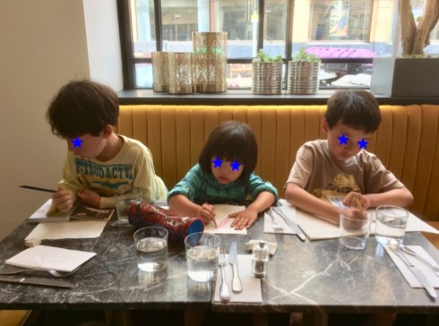 今年5月に行ったエジンバラ、お昼に入ったレストランで、思い思いに製作を始める3人。 長男は駅でもらったスコットランド鉄道路線の駅名模写、次男はエジンバラガイドブックの写真の模写、長女は好きなお絵描き。