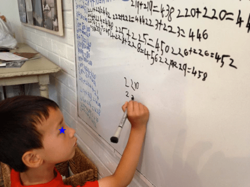 その片鱗は小さい頃から明らかで、こちらが5歳の時の彼。 覚えたばかりの足し算を使って、ホワイトボードに足し算を延々と書き出していました。
