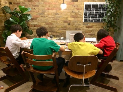 長男のお友達(緑色の子)が家に遊びに来たとき、家に帰ってすぐお絵描きを始める次男(6歳)と長女(4歳)に影響されて、一緒にお絵描きを始めた長男(8歳)と友達(9歳)。