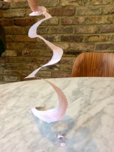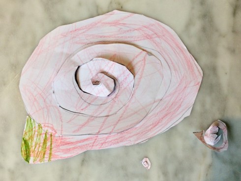 渦巻きに沿って切るのは、左手で紙を支えて右目で描かれた線を追い、左手で紙を回しながら右手で切っていく、という3歳児には高度な技だそうで、保育園で保母さんに絶賛されたことがまだ記憶にあるのでしょうか? とにかく切るのが好き。