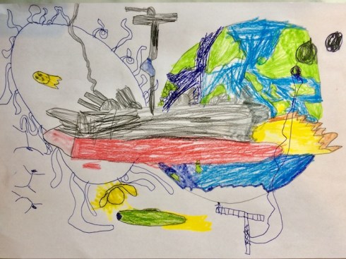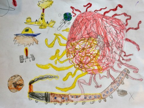 真ん中の黒い物体はガミラスに向かう宇宙戦艦ヤマト、地球から青ペンで下の方に伸びている線は、のび太がドラえもんの道具を使って宇宙に飛び出している姿。 太陽を覆っている熱い気体(ガス?)まで描かれています。 ちなみにうちの子たちは全員ロンドン生まれのロンドン育ち。
