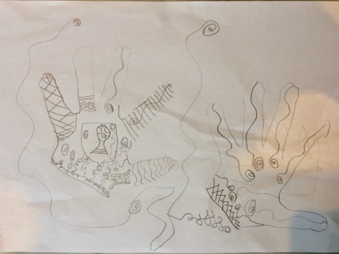 こちらは、今週は学校でインドについて学ぶ週だったので、「インドでは結婚式で手にヘナを描くんだよ」と言いながら描いていたもの。 描いている最中で、ロシアW杯のおみやげでもらったキーホルダーが目に入ってしまい、ヘナの図柄のひとつがW杯トロフィーになっています。