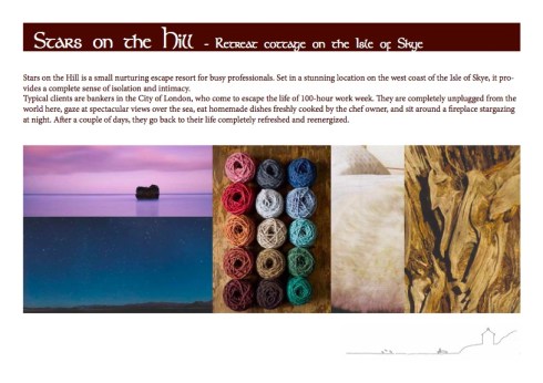 「イギリス国内」という制限がついていたので選んだ場所はスコットランド北部に位置するスカイ島。 上がそのリゾートのイメージボードです(クリックすると拡大します)。
